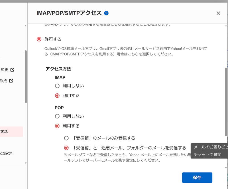左側に IMAP/POP・SMTPアクセスの設定がある